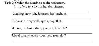 Task 2. Order the words to make sentences. 1. often, to, cinema, he, the, cinema. 2.eating, now, Mr. Johnson, his lunch, is. 3.doesn't, very well, speak, boy, that. 4. now, understanding, you, are, this rule? 5.books, many, every year, you, read, do ?СРРЧНО ПОМОГИТЕ!ДАМ 100 БАЛОВ!