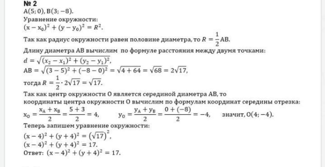 AB - диаметр окружности с центром O. Если координаты точек A и B равны (5; 0), (3; -8) соответственно, то создайте уравнение круга.