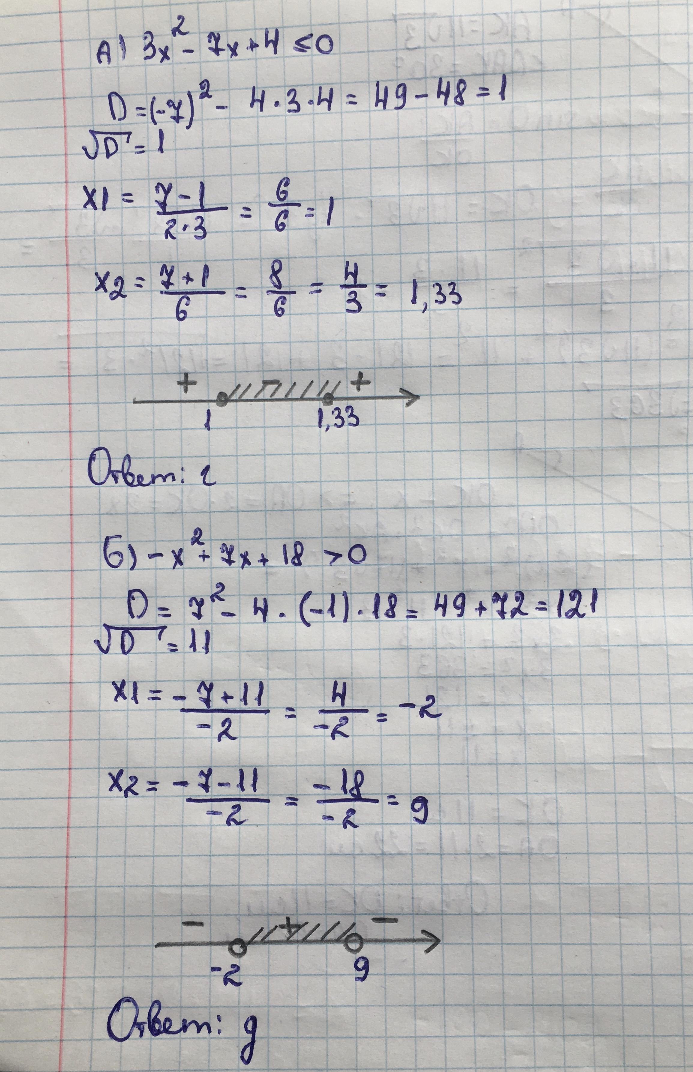 А) 3x² – 7x +4 ≤ 0 B) – x² + 7x + 18 > 0