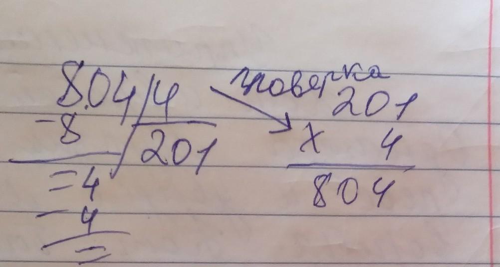 804:4=201 проверка: 201*4=804