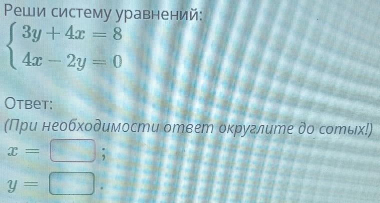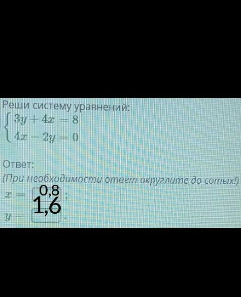 х=0,8 у=1,6 Проверка :3у+4х=8 3×1,6+4×0,8=8 4,8+3,2=8 8=8. эта проверка -доказательство верных ответов,если решение тебе не нужно