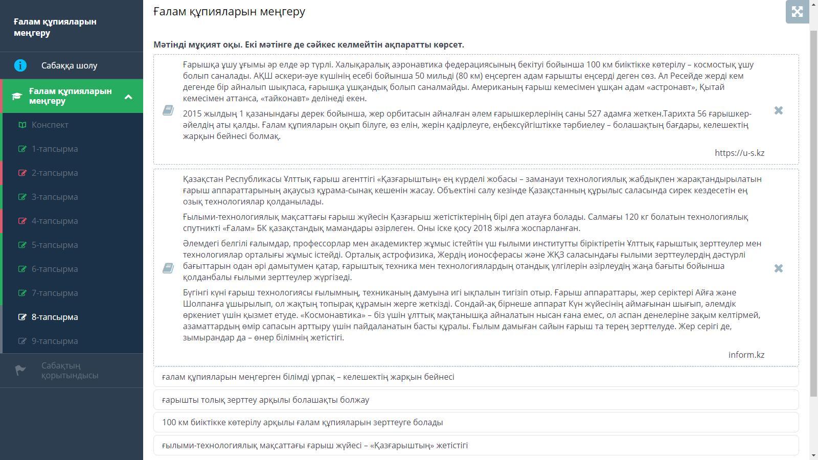 9) 1- ғарышка ұшу; 2- еліміздегі ғарышты.