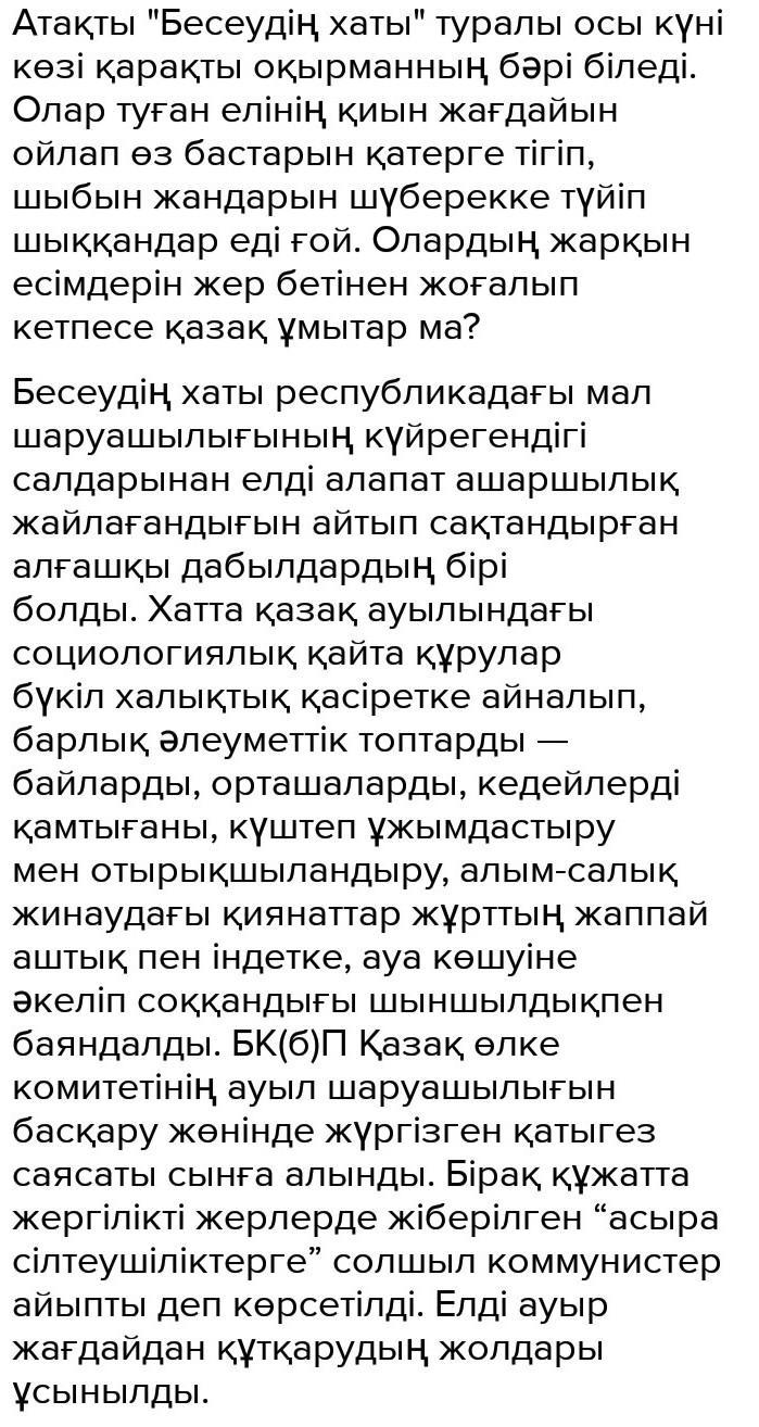 "Бесеудің хаты» - жас ұрпаққа азаттықтың қандай қасіретпен келгенін ұғындырар сүбелі туынды"деген тақырыпта әдеби сын жаз. (90-100 сөз )