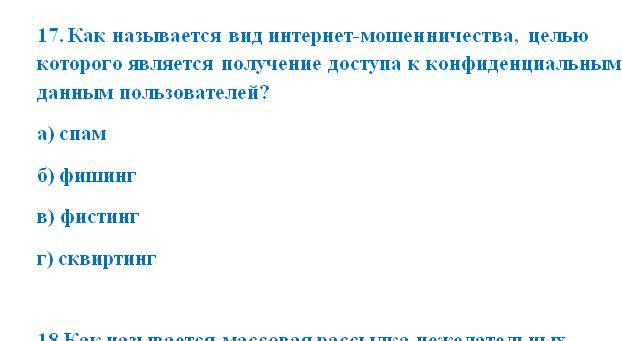17. Как называется вид интернет-мошенничества, целью которого является получение доступа к конфиденциальным данным пользователей?