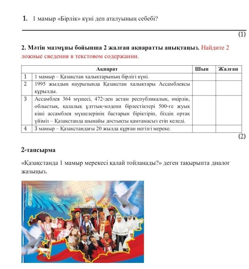 1.1 мамыр «Бірлік» күні деп аталуының себебі?(1)2. Мәтін мазмұны бойынша 2 жалған ақпаратты анықтаңыз. Найдите 2 ложные сведения в текстовом содержании.АқпаратШынЖалған11 мамыр –Қазақстан халықтарының бірлігі күні.21995 жылдың наурызында Қазақстанхалықтары Ассамблеясы құрылды.3Ассамблея 364 мүшесі, 472-ден астам республикалық, өңірлік, облыстық, қалалық ұлттық-мәдени бірлестіктері 500-ге жуық кіші ассамблея мүшелерінің бастарын біріктіріп, біздің ортақ үйіміз –Қазақстанда шынайы достықты қамтамасыз етіп келеді.43мамыр –Қазақстандағы 20 жылда құрған негізгі мереке.(2)2-тапсырма«Қазақстанда 1 мамыр мерекесі қалай тойланады?» деген тақырыпта диалог жазыңыз.