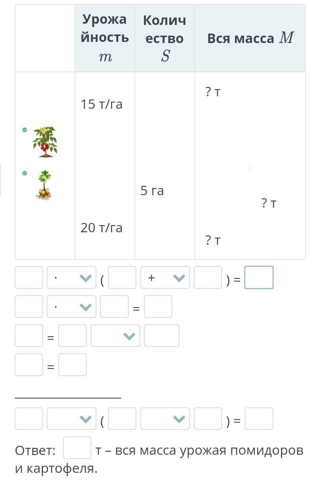 На фермерском поле площадью 5 гектаров растут помидоры и на такой же площади поля растёт картофель. Сколько всего тонн урожая соберёт фермер, если урожайность помидоров составляет 15 тонн с одного гектара, а урожайность картофеля – 20 тонн с одного гектара?