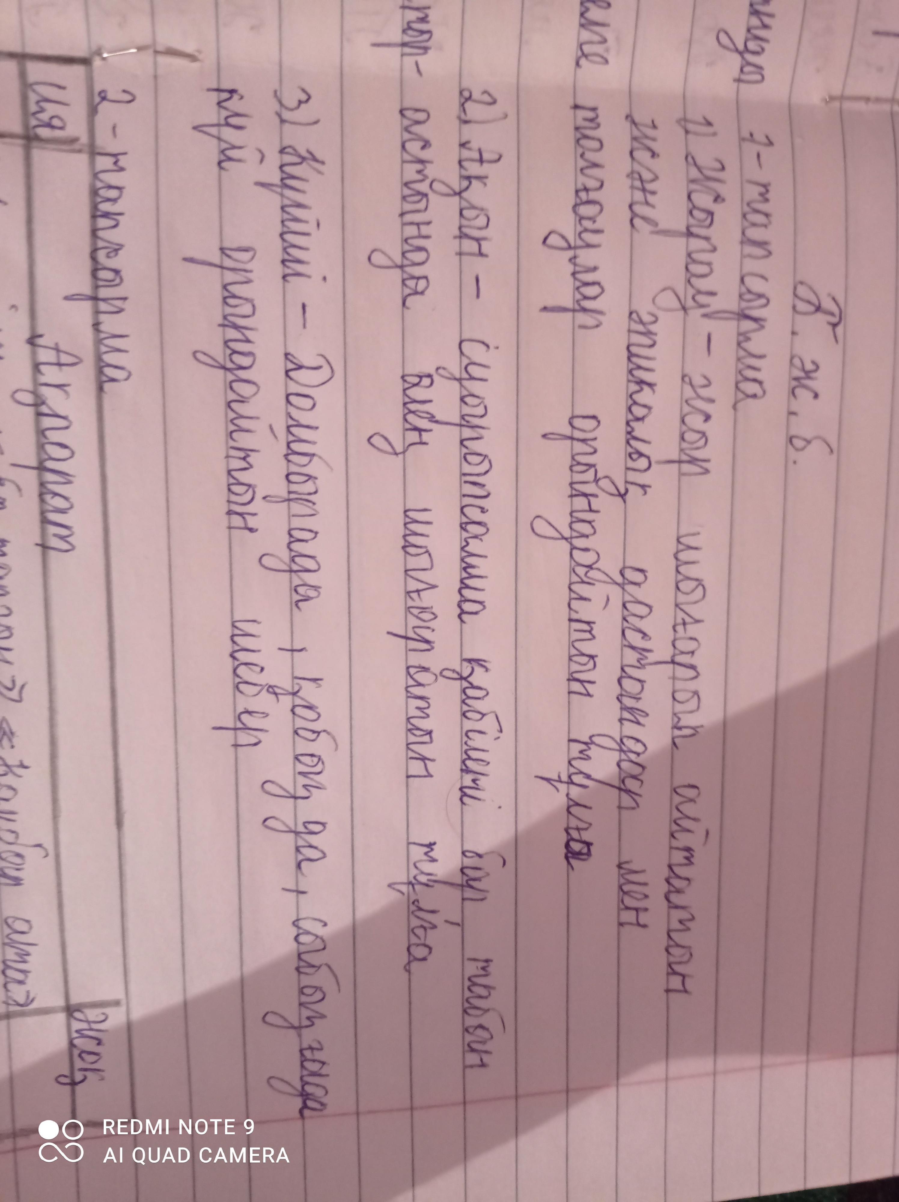 Тапсырма1. Кестеде берілген тұлғаларды анықтамамен сәйкестендір.Тұлға Анықтамасы1. Жырау А. Домбырада, қобызда, сыбызғыда күй орындайтын шебер2. Ақын Ә. Суырыпсалма қабілеті бар, табан астында өлең шығаратын тұлға3. Күйші Б. Жыр шығарып айтатын және эпикалық дастандар мен толғаулар орындайтын тұлға 2. Төмендегі ақпаратты ия/жоқ кестесі арқылы анықта.ия Ақпарттар жоқ 1. Ертегілер: «Ер Тарғын», «Қамбар батыр» 2. Күйлер: «Адай», «Балбырауын», «Ақсақ киік» 3. Эпостық жырлар: «Құламерген», «Ер Төстік» 4. Лиро-эпостық жырлар: «Айман-Шолпан», «Қозы Көрпеш-Баян сұлу» 3. Суретті қолдануда қазақ халқының қолданбалы өнеріндегі 3 жетістігін көрсетіп, сипаттама бер. http://www.taran-musey.kz/tsimgpage/00013997/bimage007.jpg 1_____________________ 2_____________________ 3_____________________ 4. Көшпелілердің шаруашылық өмірінің ерекшеліктерін мәтіннен анықтап жаз. Деректерге сүйенсек, Темір, Ырғыз, Торғай, Атбасар, Ақмола, Қарқаралы уездері жерлерінде жаздық жайылымдар солтүстік бөліктерінде (далалық зона), ал қыстық жайылымдар оңтүстік (шөлейтті) зонада орналасты. Сол себепті бұл аймақты мекендеуші қазақтар өз уездері аумағында көшіп-қонып жүрді. Солтүстік өңірде қысты күндері мал табындарын ұстайтын, қыстаулардан алыс орналасқан жайылымдар болды Қысқы жайылымдарға өзен, көлдердің жағасындағы қамысты алқаптар, тау бөктерлері, кішігірім таулардың оңтүстік беткейлері, орманды жерлер немесе құмның ішіндегі жерлер таңдап алынды. Жазы салқын ауасы, шөбі мол, ауыз су мен мал суғаратын судың жеткілікті болатын, шыбын-шіркеудің жоқтығымен ерекшеленген жерлерге қоныс тепті.1.............................................................................................................................................2.............................................................................................................................................3............................................................................................................................................. 4..............................................................................................................................................