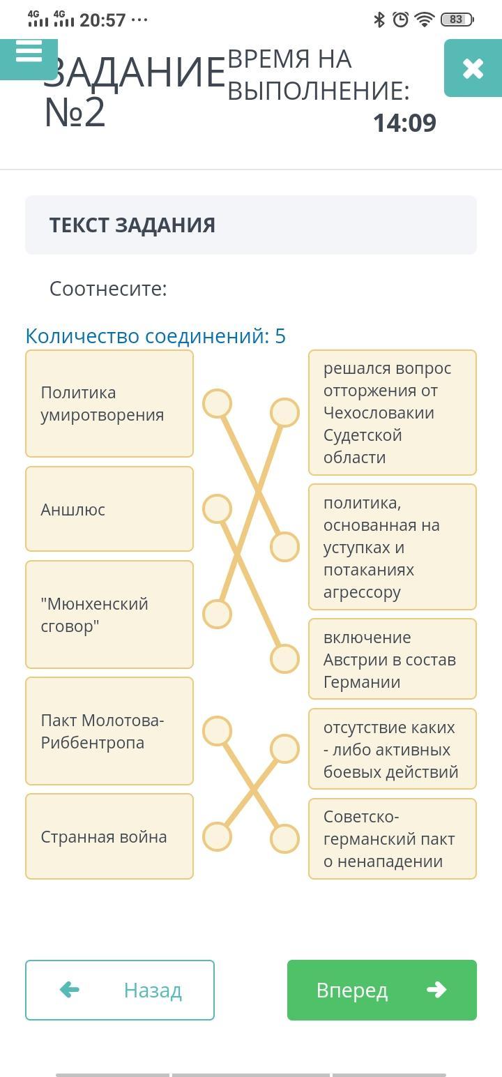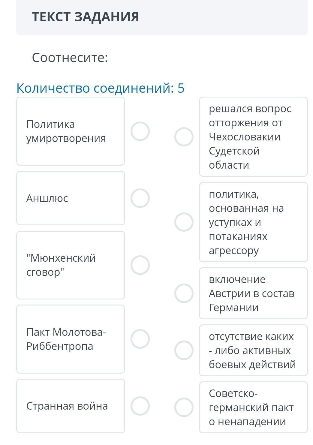 Соотнесите: количество соединений: 5 политика умиротворения решался вопрос отторжения от чехословакии судетской области аншлюс "мюнхенский сговор" политика, основанная на уступках и потаканиях агрессору включение австрии в состав германии пакт молотова- риббентропа отсутствие каких - либо активных боевых действий странная война советско- германский пакт о ненападении
