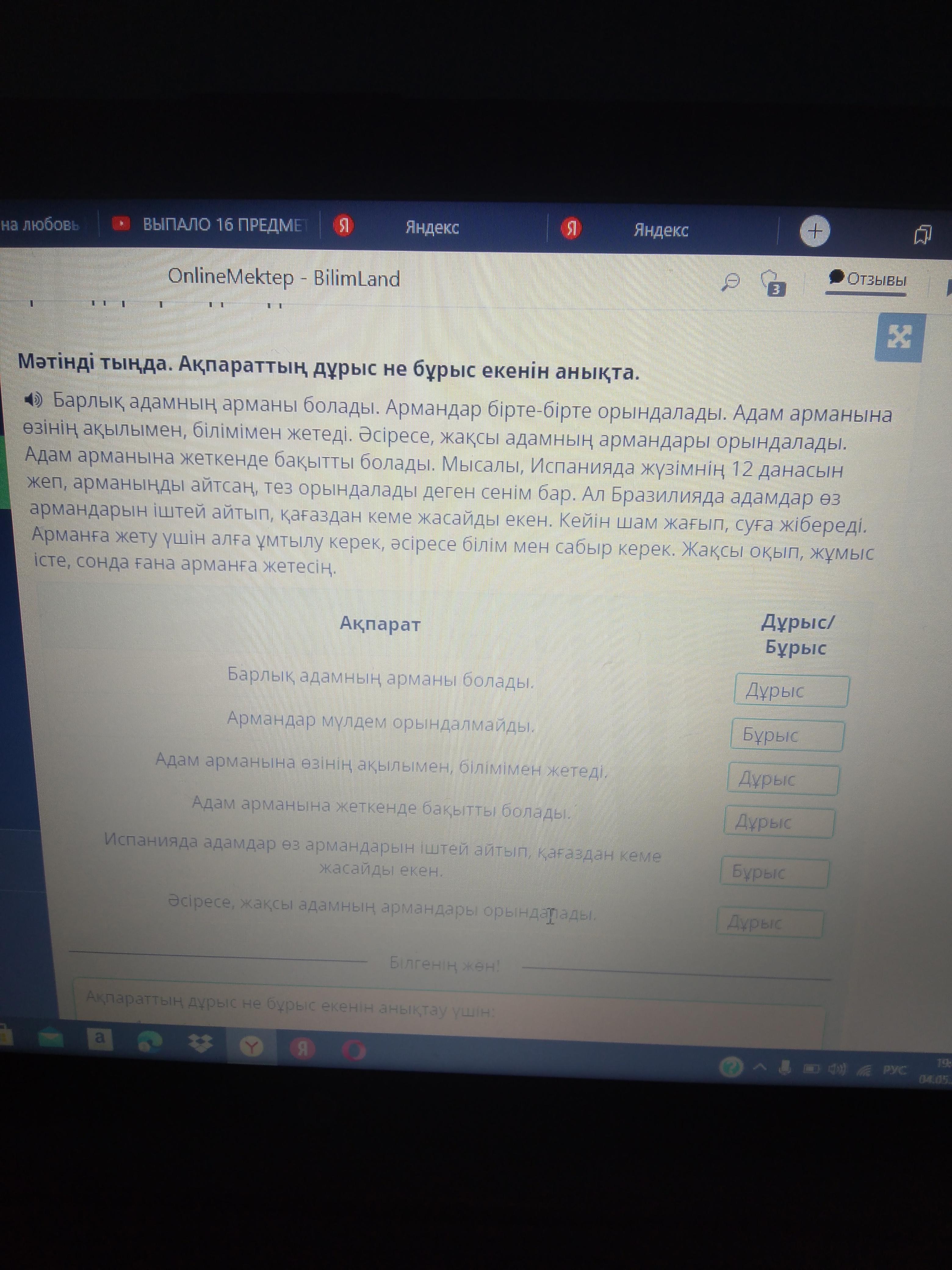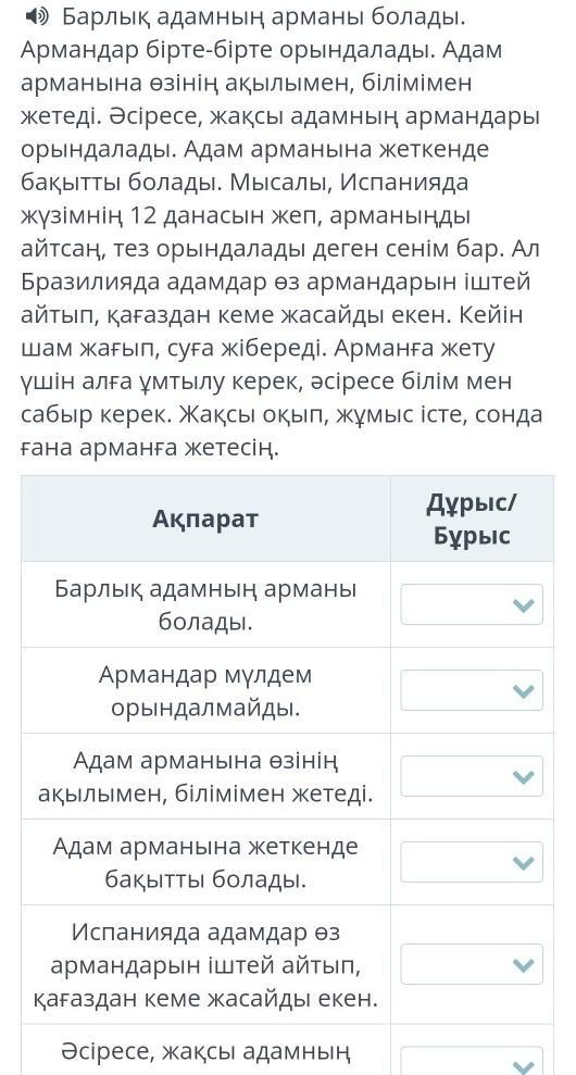 Мәтінді тыңда. Ақпараттың дұрыс не бұрыс екенін анықта.