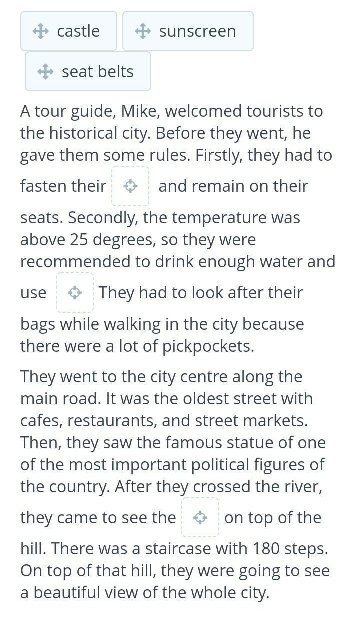Ответ:1. Seat belts 2.sunscreen 3.castle