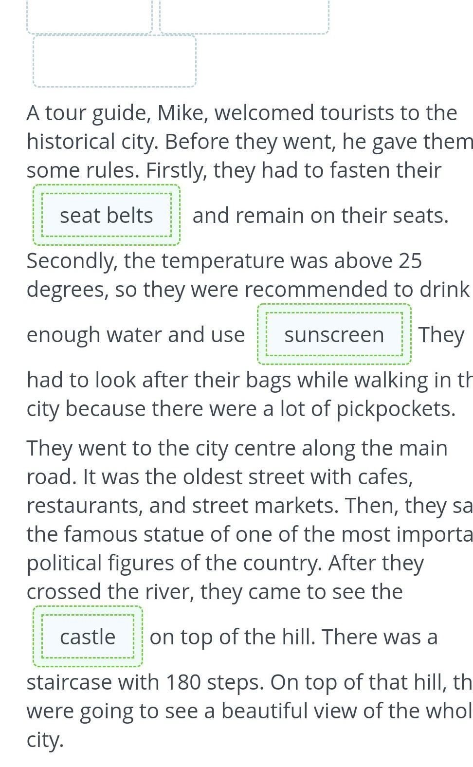 A tour guide, Mike, welcomed tourists to the historical city. Before they went, he gave them some rules. Firstly, they had to fasten their