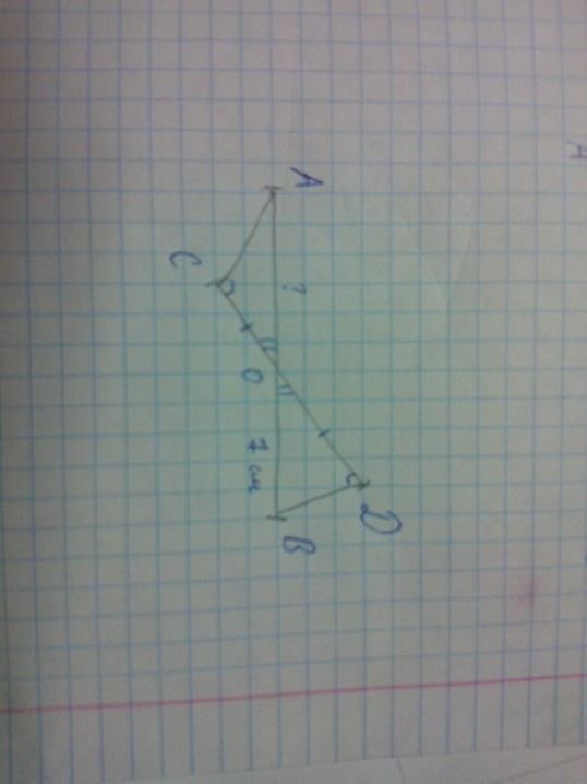Рассмотрим треугольники AOC и BOD у них есть два попарно равных угла AOC=BOD как накрест лежащие и по условию ещё два угла. Также есть равная сторона. Треугольники равны по первому признаку. AO=7 AB=7+7=14cм