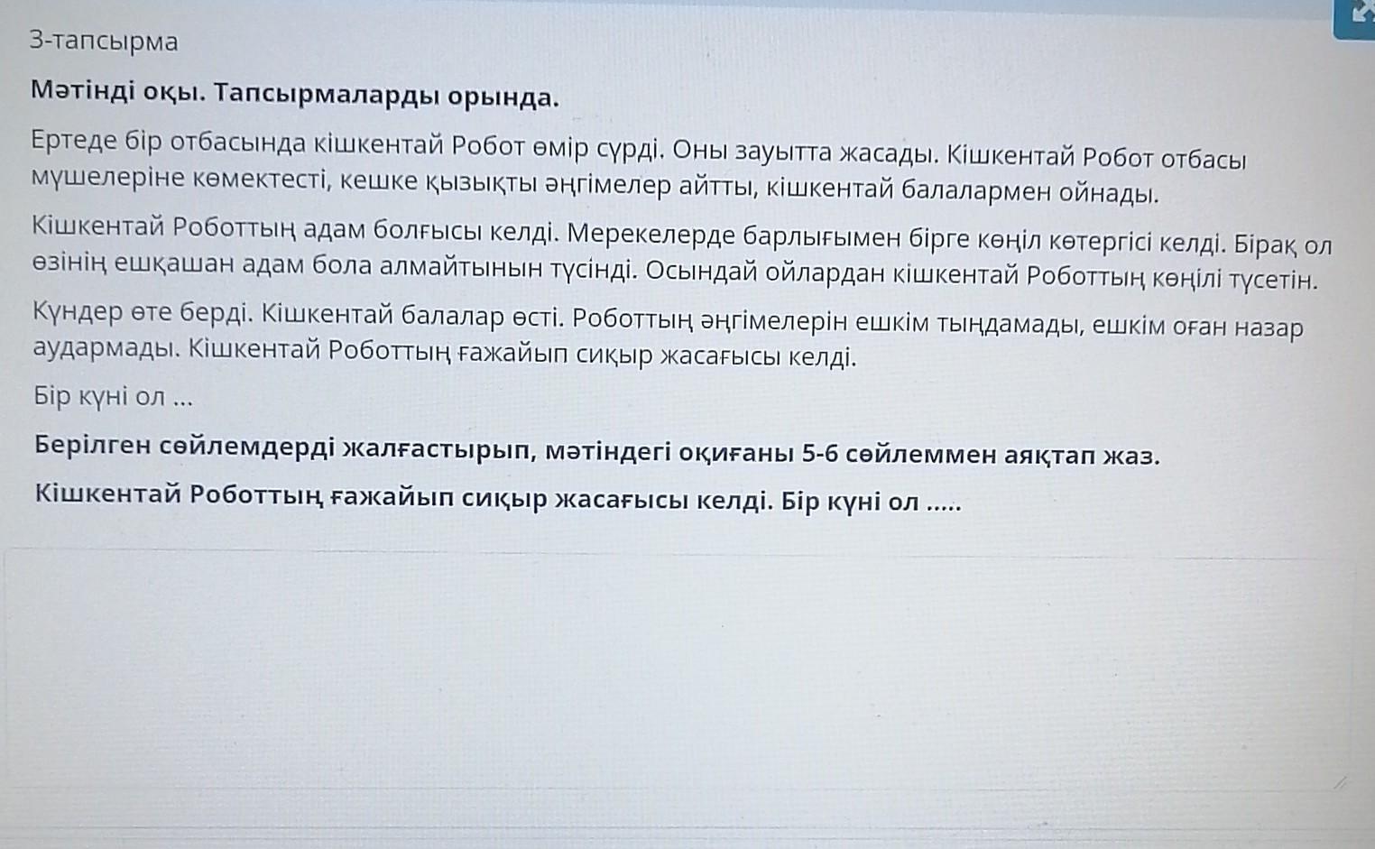 Берілген сөйлемдерді жалғастырып, мәтіндегі оқиғаны 5-6 сөйлеммен аяқтап жаз.