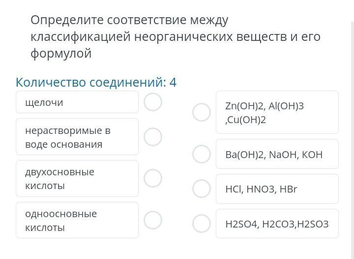 определите соответствие между классификацией неорганических веществ и его формулой