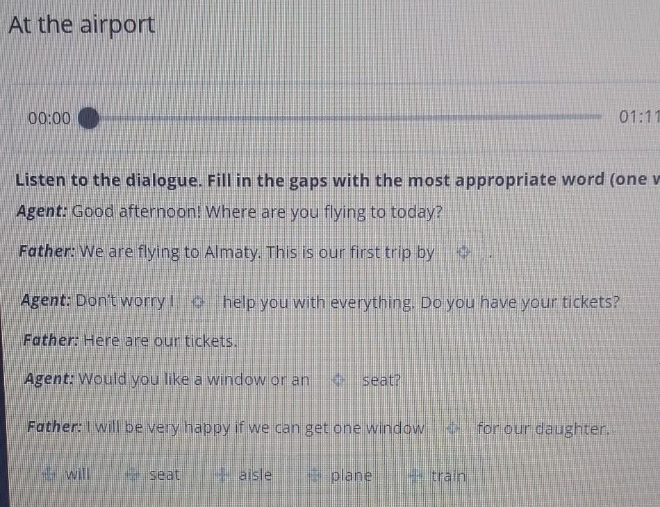 Listen to the dialogue. Fill in the gaps with the most appropriate word (one word is extra). 1)