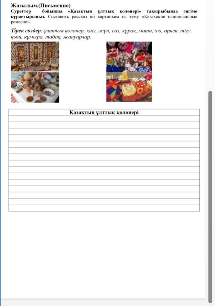 Әр бір қазақтың үйін де көрпешелер бар,көрпешелерді тігу керек оған мата, ою өрнектер керек. Ал қой жүннен жастық жасайды. Қазақтарда өз ұлттық қолөнері бар саздан қымыра, қыштар жасайды. Қазақтардың үйлері домалақ болатың оларды киіз үй деп атайтың. Қазақтар үй жануларын үстайды жылқы, сиыр, тауық тағыда басқалары. Қазақтар үлкен табаққа беш бармақ деген тағамды салып жиді.