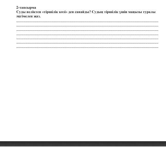 тапсырмаСуды неліктен «тіршілік көзі» деп санайды? Судың тіршілік үшін маңызы туралы әңгімелепжаз