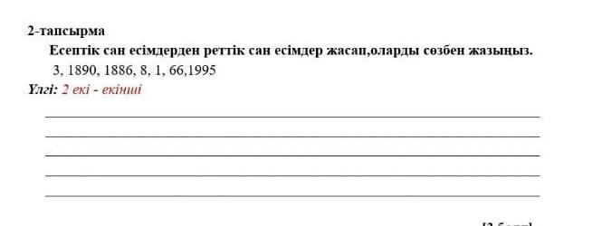 3 үш-үшінші,1890 мың сегіз жүз тоқсан-мың сегіз жүз тоқсаныншы,8сегіз-сегізінші,1бір-бірінші,66алпыс алты-алпыс алтыншы,1995мың тоғыз жүз тоқсан бес-мың тоғыз жүз тоқсан бесінші.