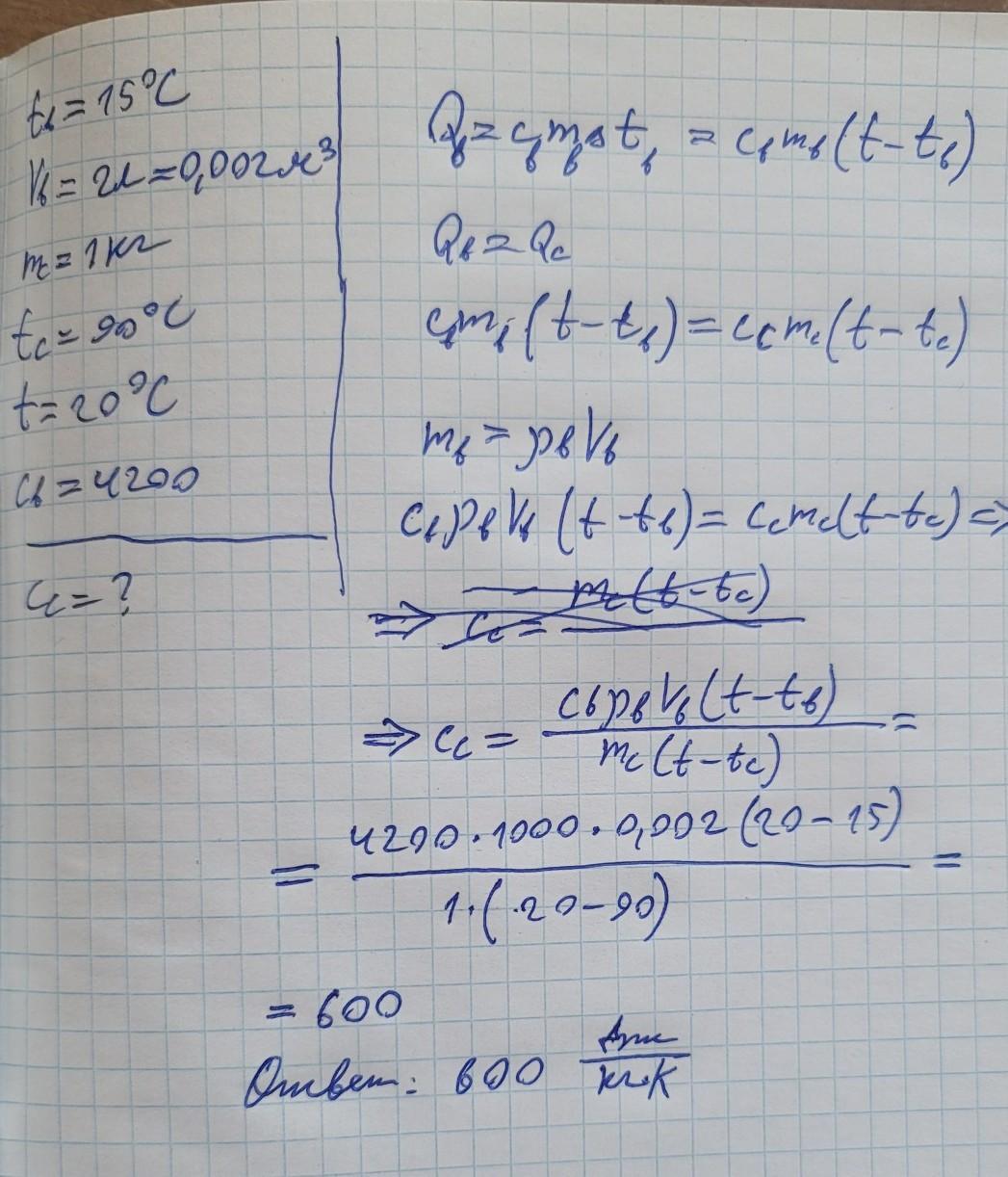 СРОЧНО 30 БАЛЛОВ Обязательно с формулами и решением В воду температурой 15°С и объемом 2 л опустили неизвестный сплав массой 1 кг и температурой 90°С. В результате теплообмена установилась температура 20°С. Какова удельная теплоемкость сплава (Дж/кг•К), если удельная теплоемкость воды равна 4200 Дж/кг•К?