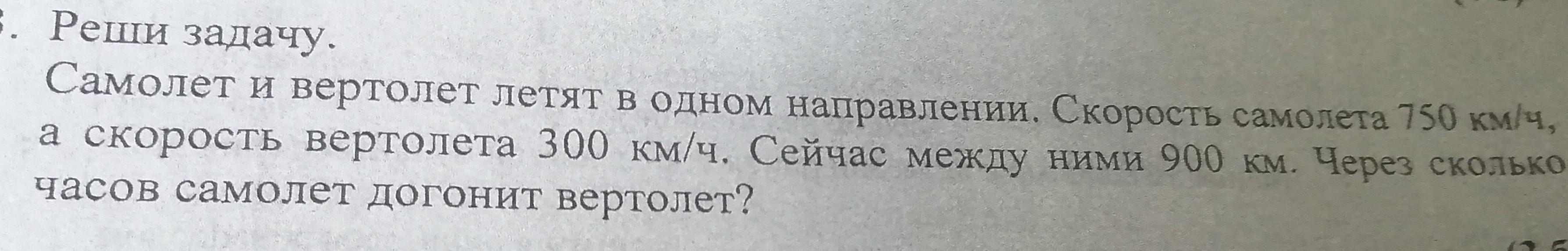 Скор вертолёта 300км/ч скор. Самолёта 750км/ч самолёт быстрее на 750-300=450км/ч