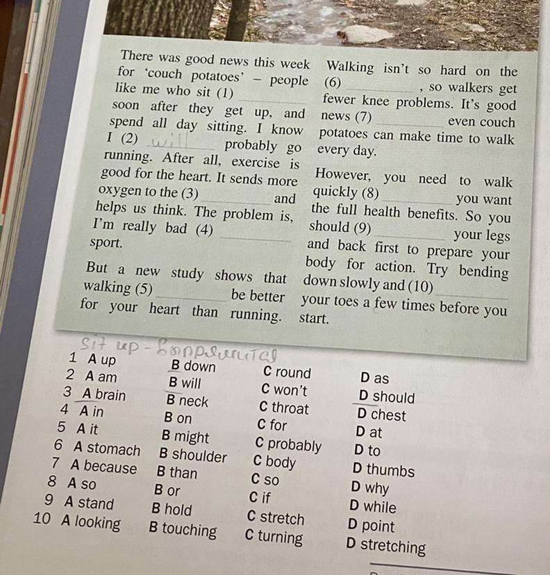 quickly (8) you want the full health benefits. So you should (9) your legs and back first to prepare your body for action. Try bending down slowly and (10)