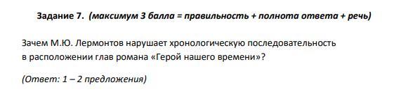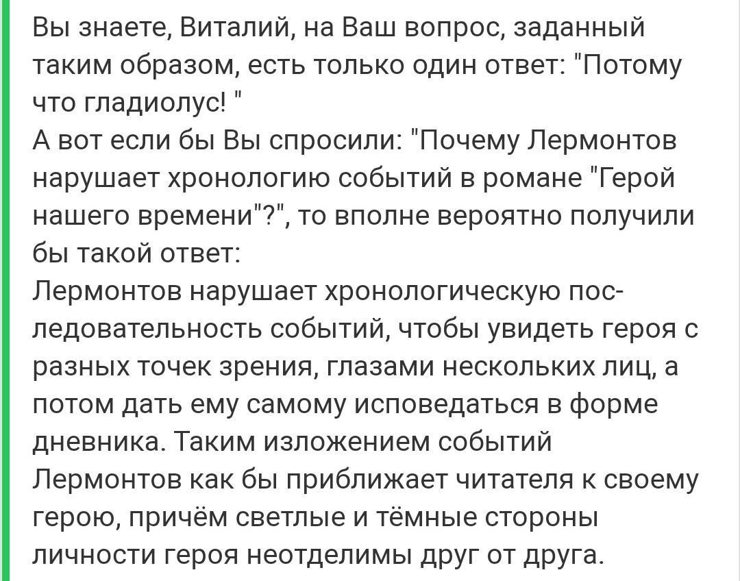 Ответ: Лермонтов нарушает хронологическую последовательность событий, чтобы увидеть героя с разных точек зрения,глазами нескольких лиц,а потом дать ему самому исповедаться в форме дневника