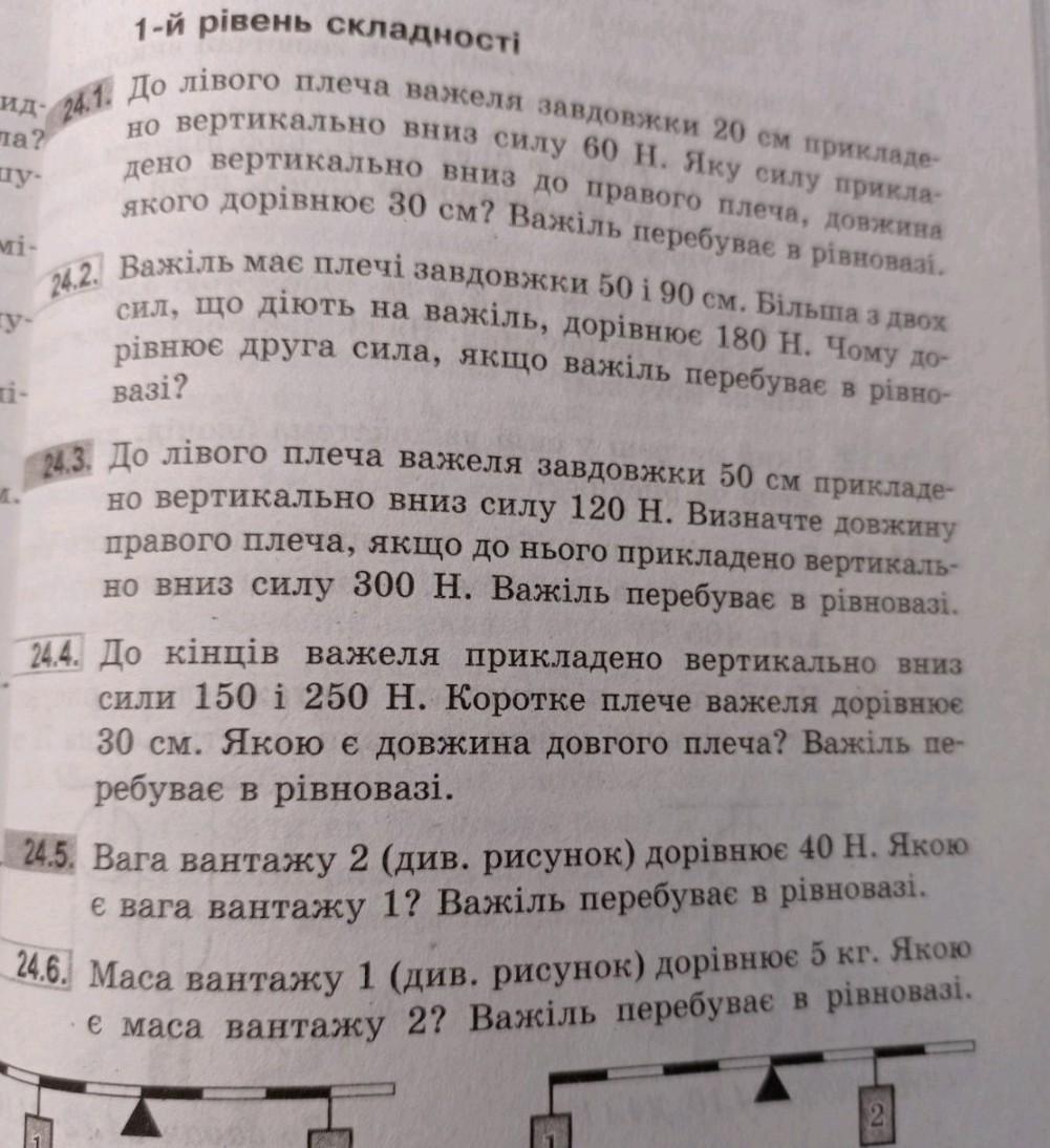 Ответ:24.1)d1=2смF1=60Hd2=300 смF2-? 24.2)т.к. рычаг в равновесии, значит моменты обоих сил равны, причем направлены в противоположные стороны (по вертикали). M1=M2; F1l1=F2l2=> F2=F1l1/l2=180*0,5/0,9=100 H. обрати внимание, что большая сила действует на плечо меньшей длины 24.3)ОбъясПо правилу рычага: 120*0,50=5*x x=120*0,50/5 = 12 24.4)Правило рычага: F₁L₁ = F₂L₂Тогда вес первого груза: P₁ = F₁ = F₂L₂/L₁ = 40 · 3 : 2 = 60 (H)