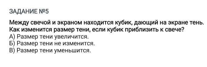 Между свечой и экраном находится кубик, дающий на экране тень. Как изменится размер тени, если кубик приблизить к свече?