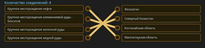 Установите соответствие между крупными месторождениями полезных ископаемых и их расположением на территории Республики Казахстан