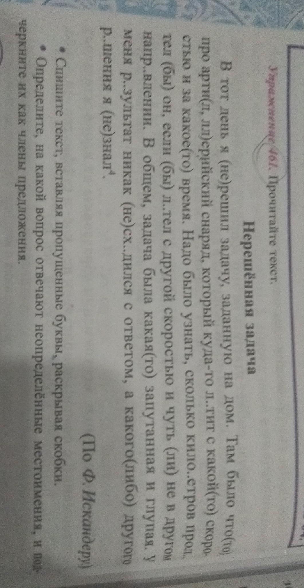 В тот день я не решил задачу, заданную на дом. Там было что-то про артиллерийский снаряд, который куда-то летит с какой-то скоростью и за какое-то время. Надо было узнать, сколько километров пролетел бы он, летел с другой скоростью и чуть ли не в другом направлении. В общем задача была какая-то запутанная и глупая. У меня результат никак не сходился с ответом, а какого-либо другого решения я не знал.(сложное, повествовательное, невосклицательное, распространённое, осложнено двумя главными членами).