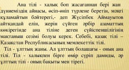 Тіл – халықтың алтын діңгегі. Өзін-өзі білетін әр халық алдымен өзінің туған тілін сыйлап, мақтан тұта білуі керек. Өйткені халықтың даналығы, жырлары, шежіресі сол халықтың тілінде жазылады. Тіл – қай ұлтта болса да қастерлі, құдіретті ұғым. Ол әр адамның бойына ана сүтімен бірге еніп, қалыптасады. Тіл – халықтың жан, сәні, тұтастай кескін-келбеті, болмысы. Адамды мұратқа жеткізетін – ана тілі. Әр халықтың, ұлттың құрмет тұтар өз ана тілі бар. Менің ана тілім – қасиетті қазақ тілі. Қазақ тілі түркі тілдердің ішіндегі ең таза әрі бай тілге жатады. Қазақ тілі – Қазақстан Республикасының мемлекеттік тілі. "Ана тілі – халық боп жасағаннан бері жан дүниеміздің айнасы, өсіп-өніп түрлене беретін, мәңгі құламайтын бәйтерегі. Жүректің терең сырларын, басынан кешкен дәуірлерін, қысқасы, жанның барлық толқынын ұрпақтан-ұрпаққа жеткізіп, сақтап отыратын қазына",-деп Жүсіпбек Аймауытов ағамыз жазғандай, жерін, елін сүйген әрбір азаматтың ана тіліне деген сүйіспеншілігінің мақтаныш сезімі болуы керек. Бала өмірге келгеннен бастап, өз ана тілінде сөйлеп, ана тілінде білім алып, жалпы ұлттық тәрбие алуы керек деп ойлаймын. Себебі өз ана тілінде сөйлеу оған деген көзқарас ең зор адамшылық, мәдениеттілік, тәрбиелілік өлшемі болып табылады. Тіл – ұлттың жаны. Ал ұлттың болашағы – оның ана тілі. Тіл халықпен бірге өмір сүріп дамиды, әр ұлттың тілі – оның бақыты мен тірегі. Елбасы Н.Ә.Назарбаев халықтың болашағы туралы тереңнен толғай отырып, "мемлекеттің ең басты дүниесі тек ғана байлық емес, сонымен қатар ана тіліміздің болашағы"деген болатын. Ана тілі – алтын қазына, ана тілін қадірлеу, беделін нығайту біздің парызымыз.
