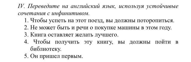 1. To catch this train you need to hurry. 2. There can be no question of buying a car this year 3. To get this book, you have to go to the library. 4. He comes first.
