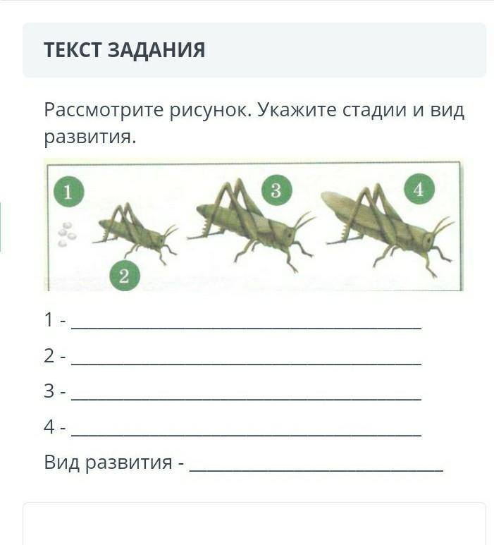 Рассмотрите рисунок. Укажите стадии и вид развития. 1 3 4 2 1-\ 2 3-\ 4-\ Вид развития -
