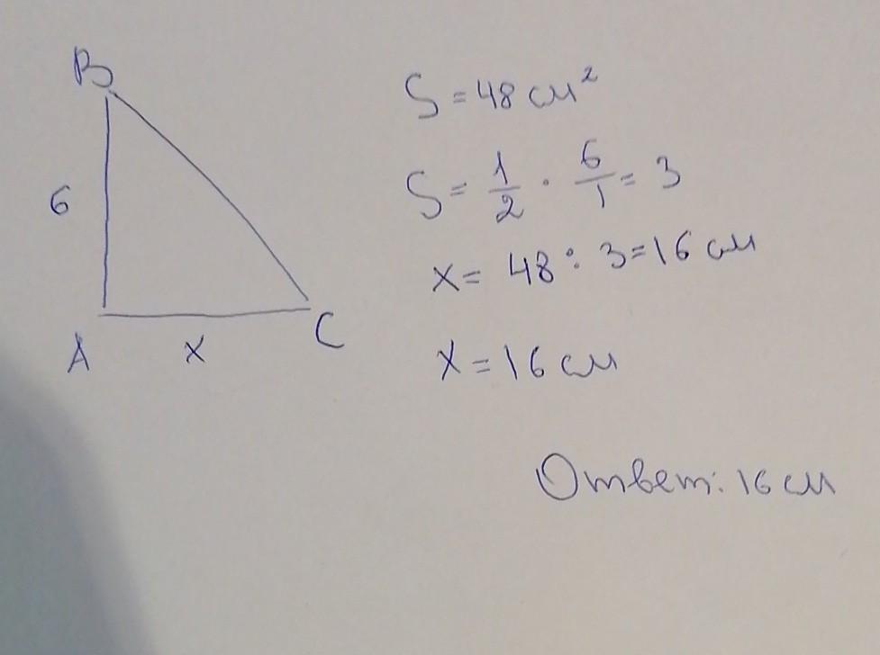16 см| S=1/2 ab 48=1/26b b=48÷3=16