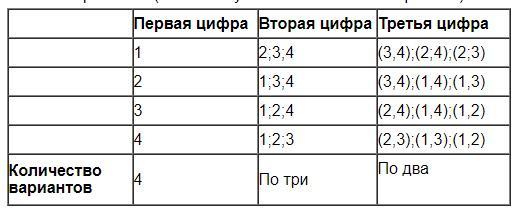 Значит, общее количество вариантов: 4*3*2 = 24 трехзначных числа.