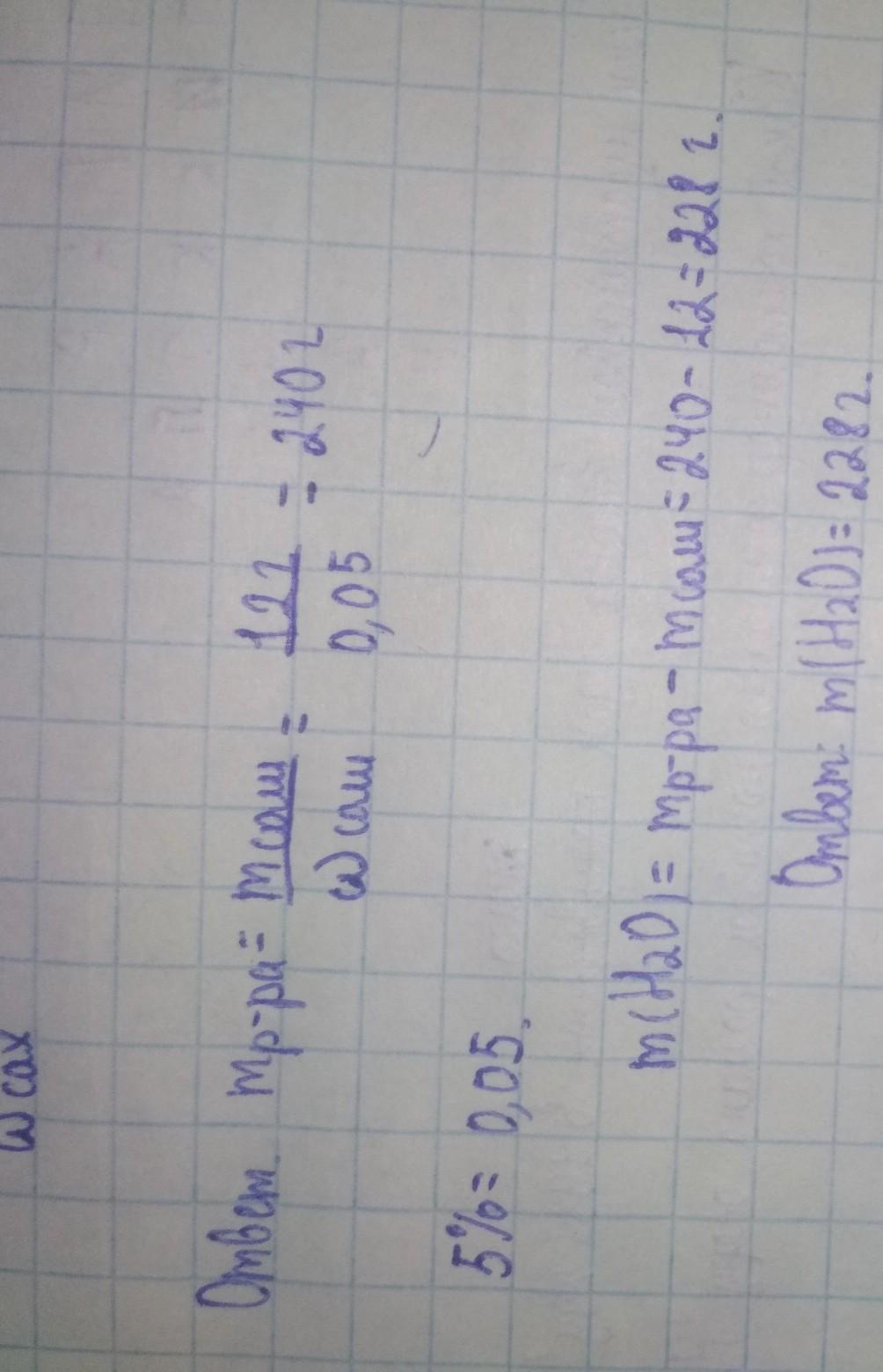 ,,Обчислити об‘єм води,який треба долити до 12г солі щоб,отримати розчин з w(p.p) 5%