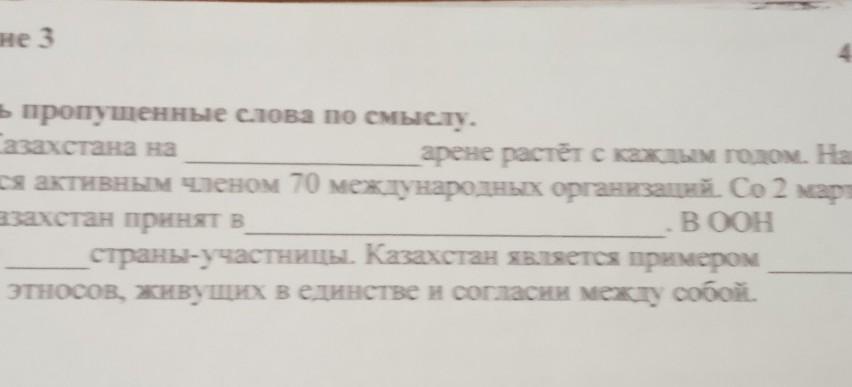 Роль Казахстана на мировой арене растёт с каждым годом. Наша страна является активным членом 70 международных организаций. Со 2 марта 1992 года Казахстан принят в Организацию Объединённых Наций. В ООН входит 193 страны-участницы. Казахстан является примером дружбы разных этносов, живущих в единстве и согласии между собой.