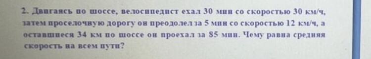 Двигаясь по шоссе, велосипедист ехал 30 мин со скоростью 30 км/ч,затем проселочную дорогу он преодолел за 5 мин со скоростью 12 км/в, а оставшиеся 34 км по шоссе он проехал за 85 мину. Чему равна средняя скорость на всем пути?
