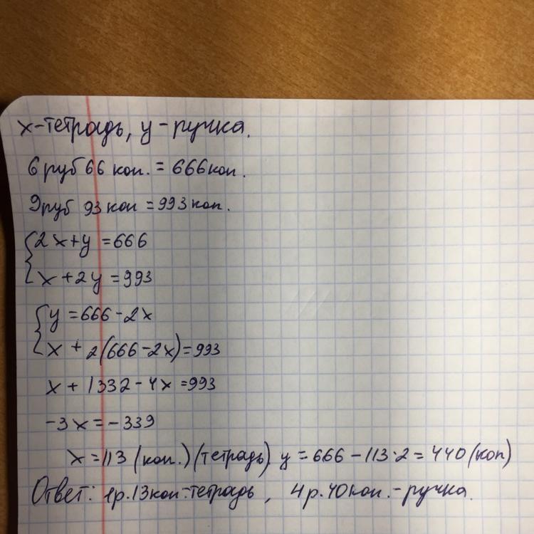 за 2 тетради и ручку заплатили 6 руб 66 копеек, за тетрадь и две ручки 9 руб 93 коп сколько стоят отдельно тетрадь и ручка?
