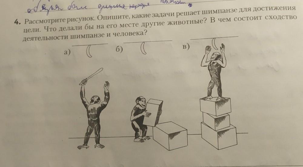 На этих картинках шимпанзе пытается достать банан. Она действует разумно, как человек. Потому что человек так же придумал бы поставить какое-нибудь возвышение, чтобы дотянуться до фрукта.