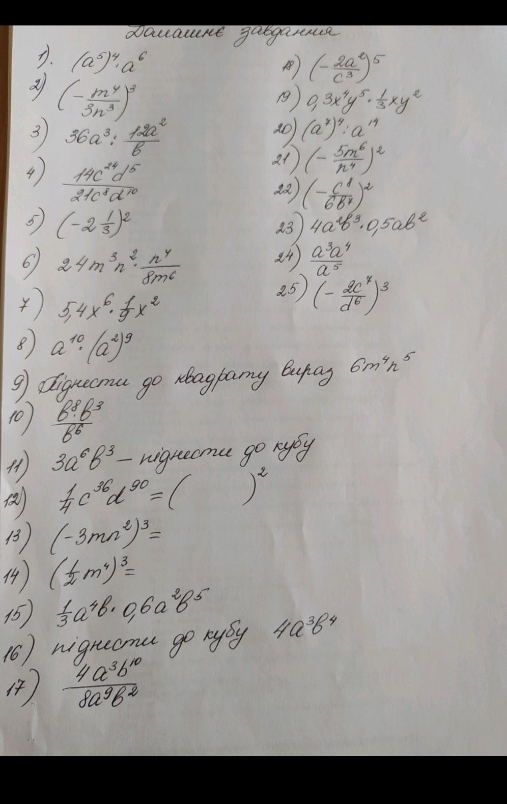 Ответ: 1) a²⁶ ; 2) a¹²/(27n⁹) ; 3) 3ab ; 4) c¹⁶/(3d⁵) ; 5) 5 4/9 ; 6) 3n⁶/m³ ; 7) 0,6x⁸ ; 8) a²⁸ ; 9) 36m⁸n¹⁰ ; 10) b⁵ ; 11) 27a¹⁸b⁹ ; 12) ( 1/2c¹⁸d⁴⁵)² ;