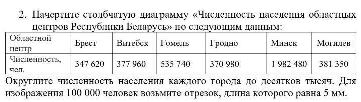начертить вертикальные полоски таких размеров : Брест -17,5 мм , Витебск- 19 мм, Гомель-26,8 мм, Гродно-18,5 мм, Минск-99 мм, Могилев-19мм.