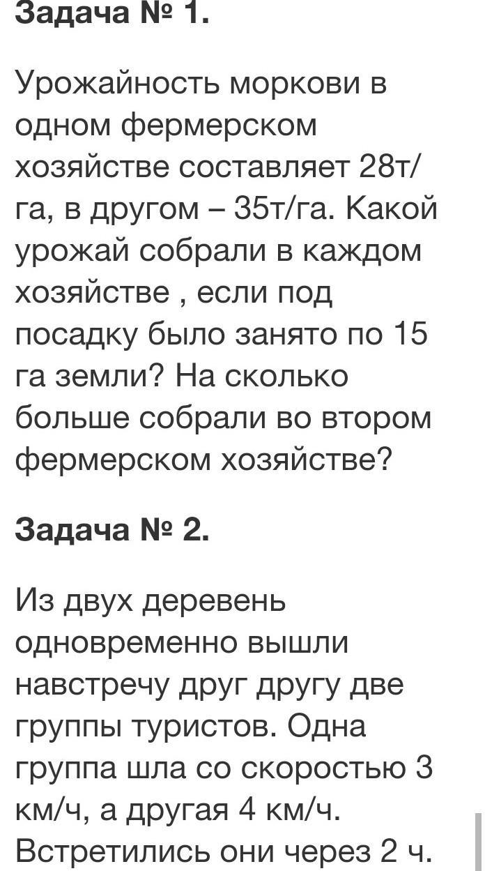 Урожайность моркови в одном фермерском хозяйстве составляет 28т/ га, в другом - 35т/га. Какой урожай собрали в каждом хозяйстве , если под посадку было занято по 15 га земли? На сколько больше собрали во втором фермерском хозяйстве?