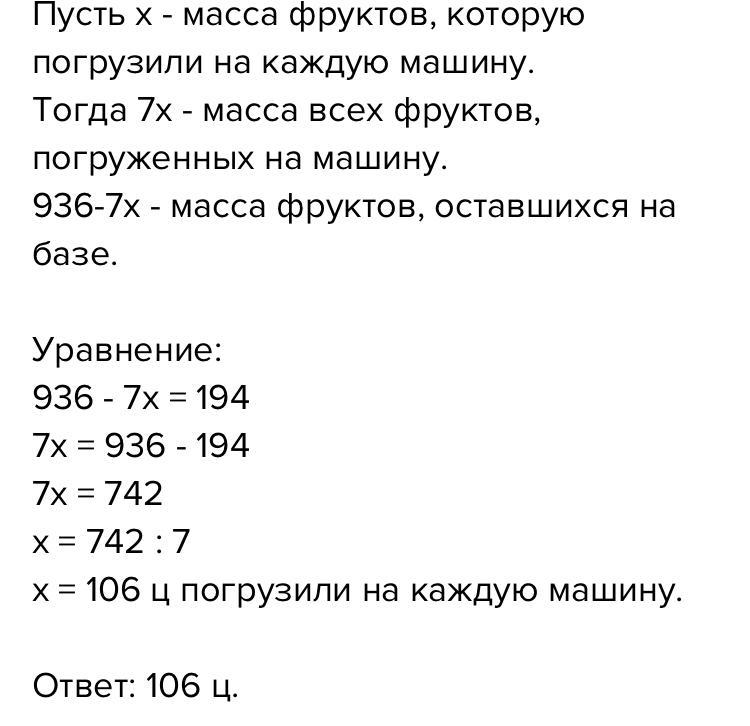 На базе было 936 центнеров фруктов. После того, как несколько центнеров фруктов увезли на 7 машинах поровну на каждой, там осталось 194 центнеров фруктов. Сколько центнеров фруктов погрузили на каждую машину?