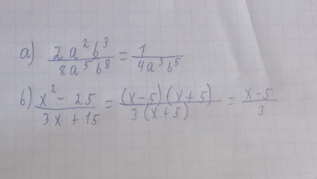 а) 2а²b³/8a⁵b⁸= a²b³/4a⁵b⁸= b³/4a³b⁸= 1/4a³b⁵