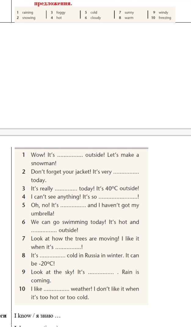 1 snowing,2 freezing,3hot ,4foggy5 raining,6 warm,7 windy.8cold9cloudy10sunny