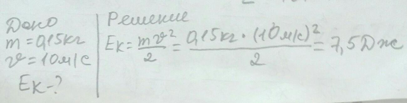 Определите кинетическую энергию шара массой 0,15 кг, катящегося по траве со скоростью 10 м/с.