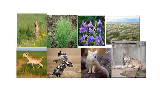 Б) Животные степи-Выделяется практически один надземный ярус, населённый зерноядными грызунами (суслики, сурки), копытными (сайгаки), пресмыкающимися (ящерицы, полозы, степные гадюки). Много птиц — куропатки, перепела, жаворонки, дрофы, степные орлы.