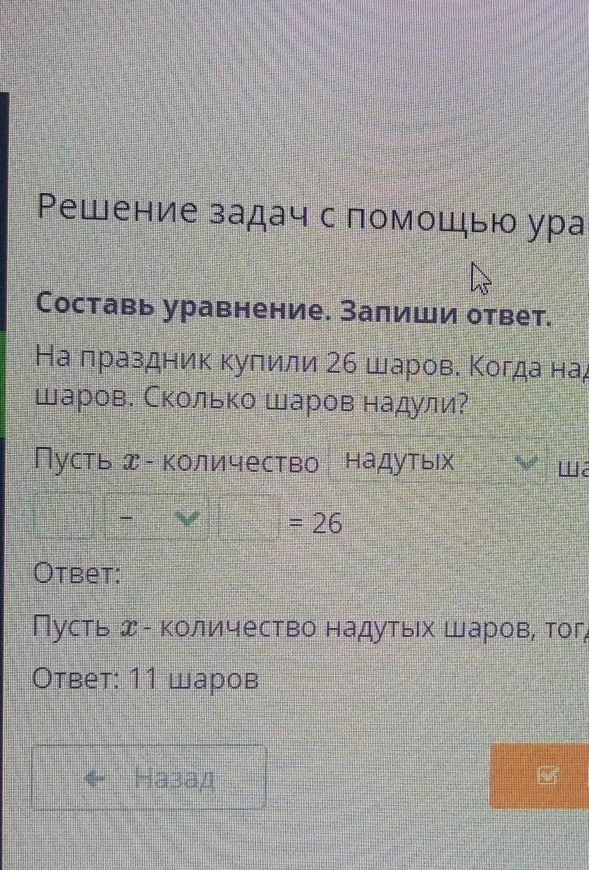 Составь уравнение запиши ответ На праздник купили 26 шаров когда надули несколько шаров осталось надуть ещё 15 шаров сколько шаров надули?, дам 40 баллов