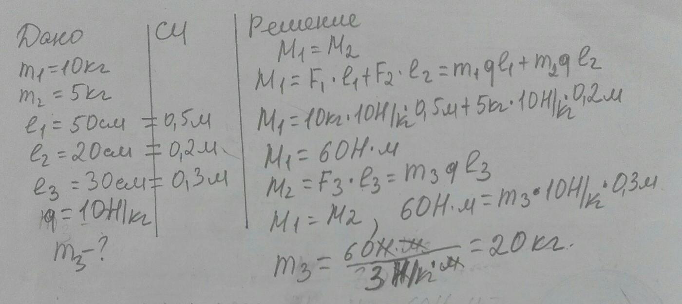 Зліва на важіль підвісили вантажі 10кг та 5кг на відстані 50см та 20см від осі обертання. Знайти вагу вантажу, який необхідно підвісити на важіль справа від осі обертання на відстані 30см.G;